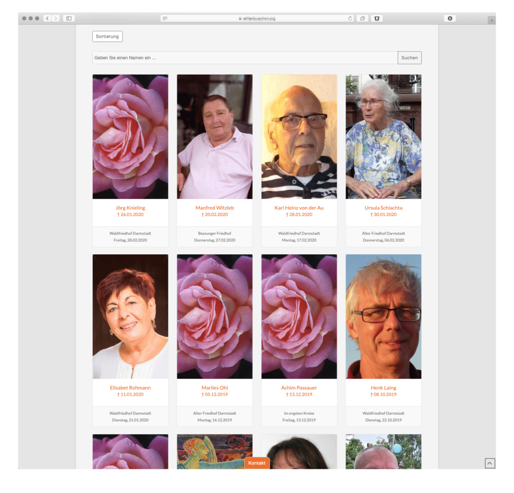 Auf der Bestatter-Webseite werden alle veröffentlichten Trauerfälle in einer Übersicht auf der Unterseite „Gedenkseiten“ dargestellt.