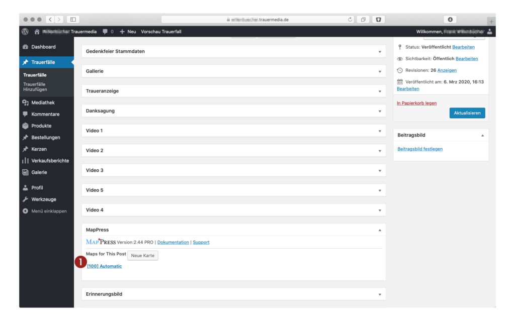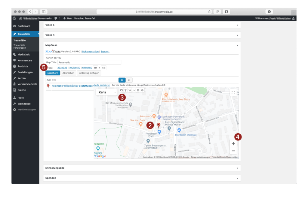 Aus den vorher eingetragenen Daten der Trauerfeier wurde bereits automatisch eine Karte erzeugt. Da Adressen von Friedhöfen nicht immer ganz eindeutig sind, kann die Karte nachträglich korrigiert werden. Zur Kontrolle und Bearbeitung der Karte auf 1 „[xx] Automatic“ klicken.