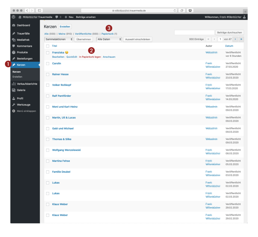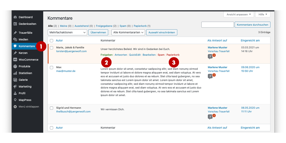 Im Bereich 1 „Kommentare“ werden alle Kondolenzeinträge aufgelistet. Nach Prüfung können Sie den jeweiligen Eintrag 2 „Freigeben“ und ihn somit auf der Gedenkseite freischalten oder ihn 3 löschen („In den Papierkorb legen“). Es ist auch möglich, den Eintrag zu bearbeiten.