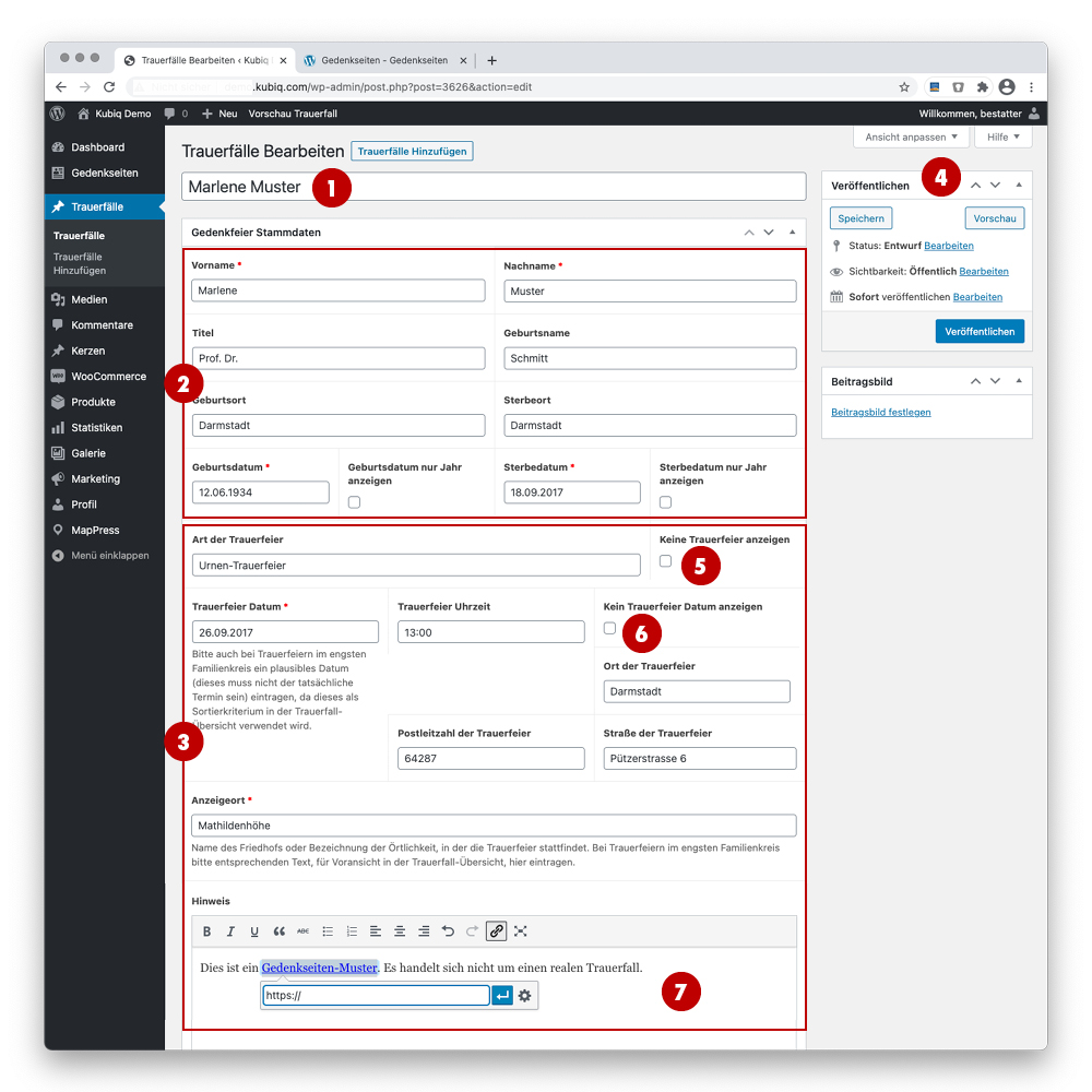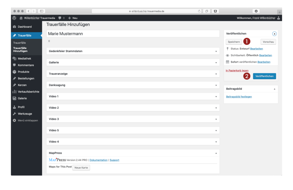 Rufen Sie nun die Seite ihre-webseite.de/gedenkseiten auf und kontrollieren den gerade angelegten Trauerfall. Soll die Veröffentlichung zurückgenommen werden, im Trauerfall oben rechts unter „Veröffentlichen“ den Status wieder auf Entwurf stellen und aktualisieren.