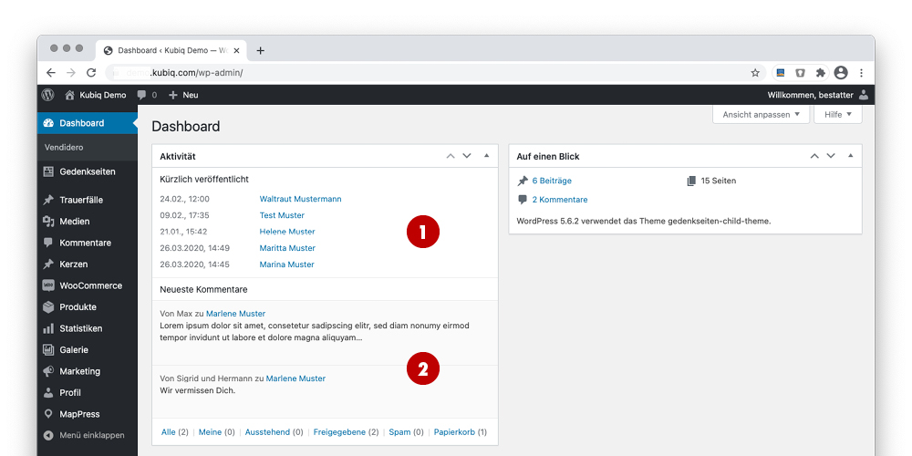 Das Dashboard zeigt einen Kurzüberblick: 1 letzte veröffentlichte Trauerfälle, 2 letzte Kondolenzeinträge