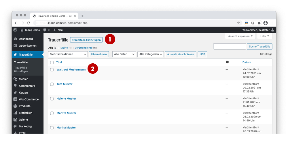 Auflistung aller bisherigen Trauerfälle: 1 zur Erstellung eines neuen Trauerfalls auf „Trauerfälle Hinzufügen“ klicken. 2 zur Bearbeitung eines vorhandenen Trauerfalls auf den Namen klicken,