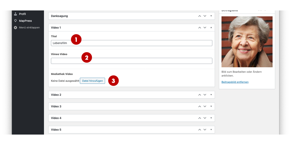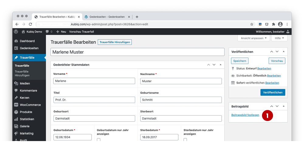 Um ein Gedenkseitenbildmotiv oder Verstorbenen-Portrait hinzuzufügen, auf 1 „Beitragsbild festlegen“ klicken.