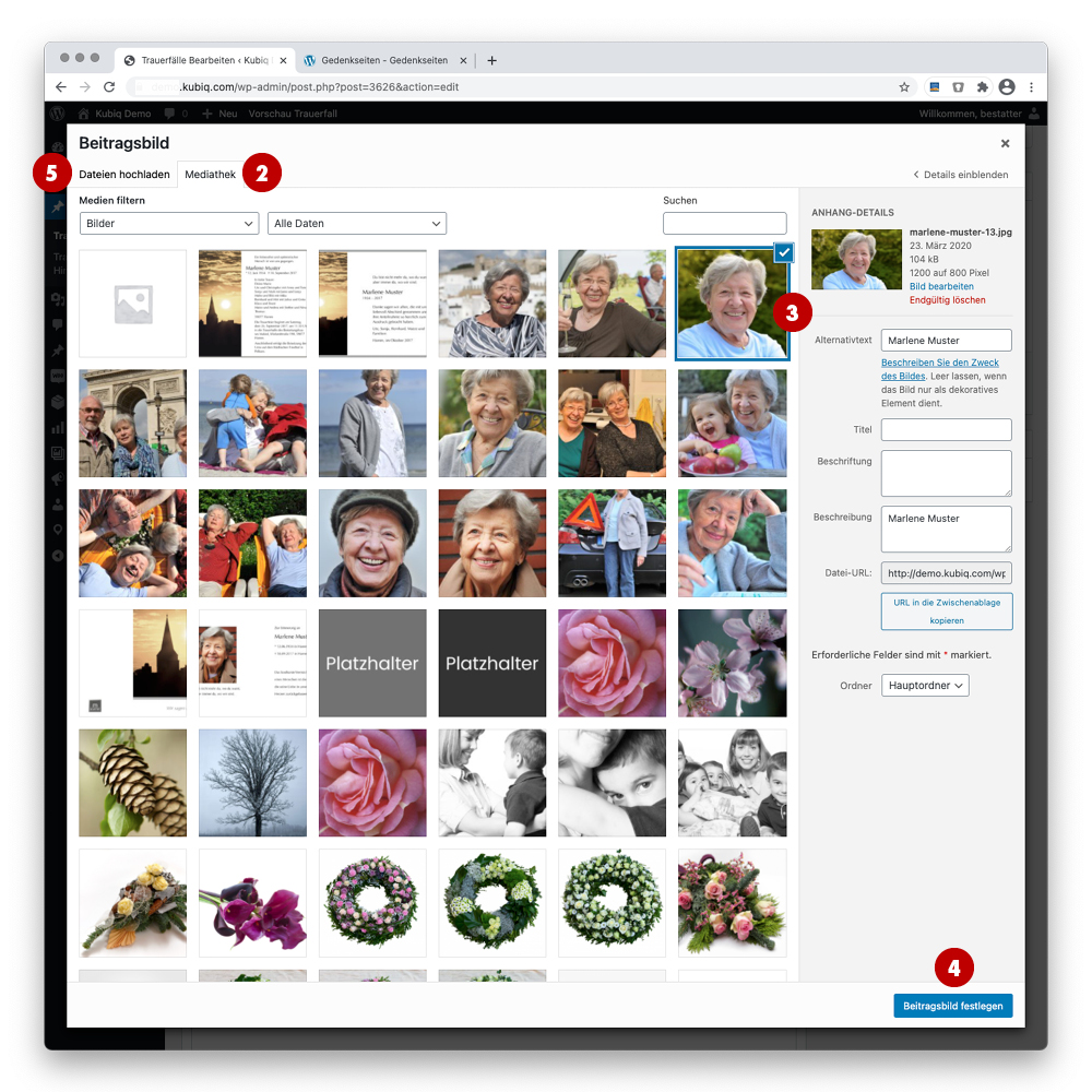 Hier entweder auf 2 „Mediathek“ klicken, 3 ein verfügbares Motiv wählen und mit 4 „Beitragsbild festlegen“ bestätigen. Oder über 5 „Dateien hochladen“ ein Bild vom lokalen PC uploaden.
