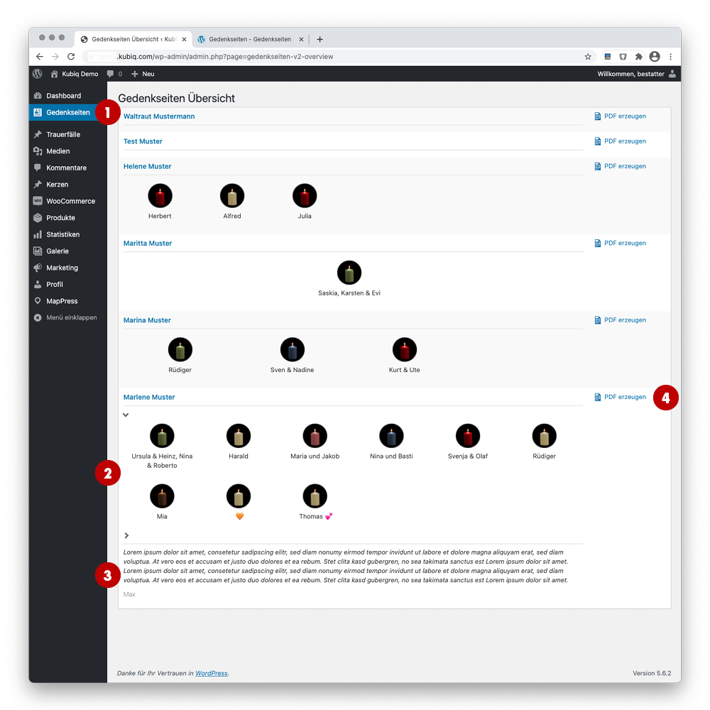 Ganz rechts in der Spalte kann per Klick auf 4 „PDF erzeugen“ ein PDF erstellt werden. Im PDF enthalten sind alle Kondolenzeinträge und entzündeten Kerzen, darüber hinaus auch die eingestellten Galerie-Bilder und Trauerdruck-Abbildungen. Das PDF wird nach Erstellung automatisch heruntergelden.