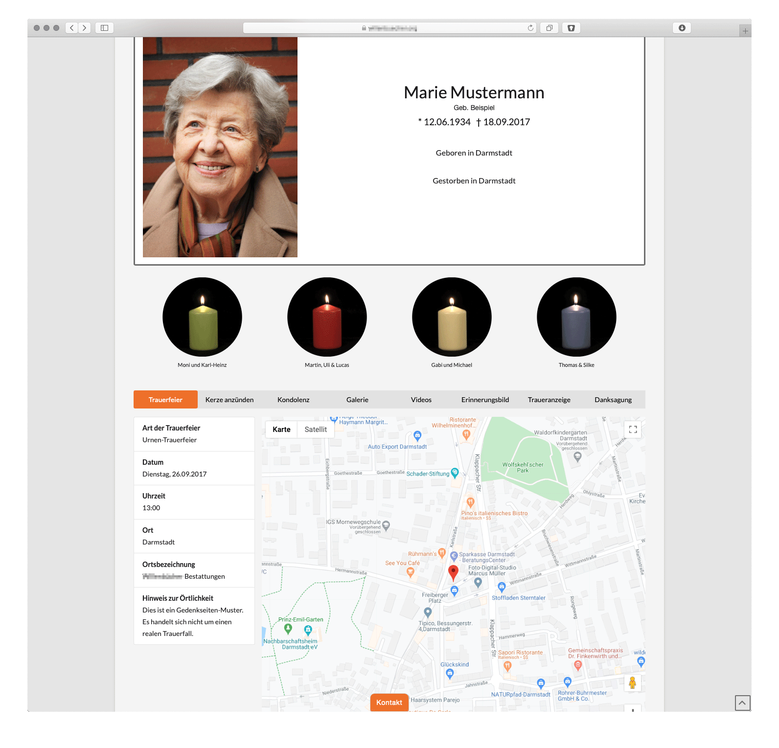Ein Klick auf 1 „Gedenkseiten“ öffnet eine Übersicht, die die aktuellen Seiten inklusive der dazugehörigen 2 Kerzen und 3 Kondolenzeinträge zeigt. Ein Klick auf die Pfeile am linken Rand erweitert gegebenenfalls die Darstellung.