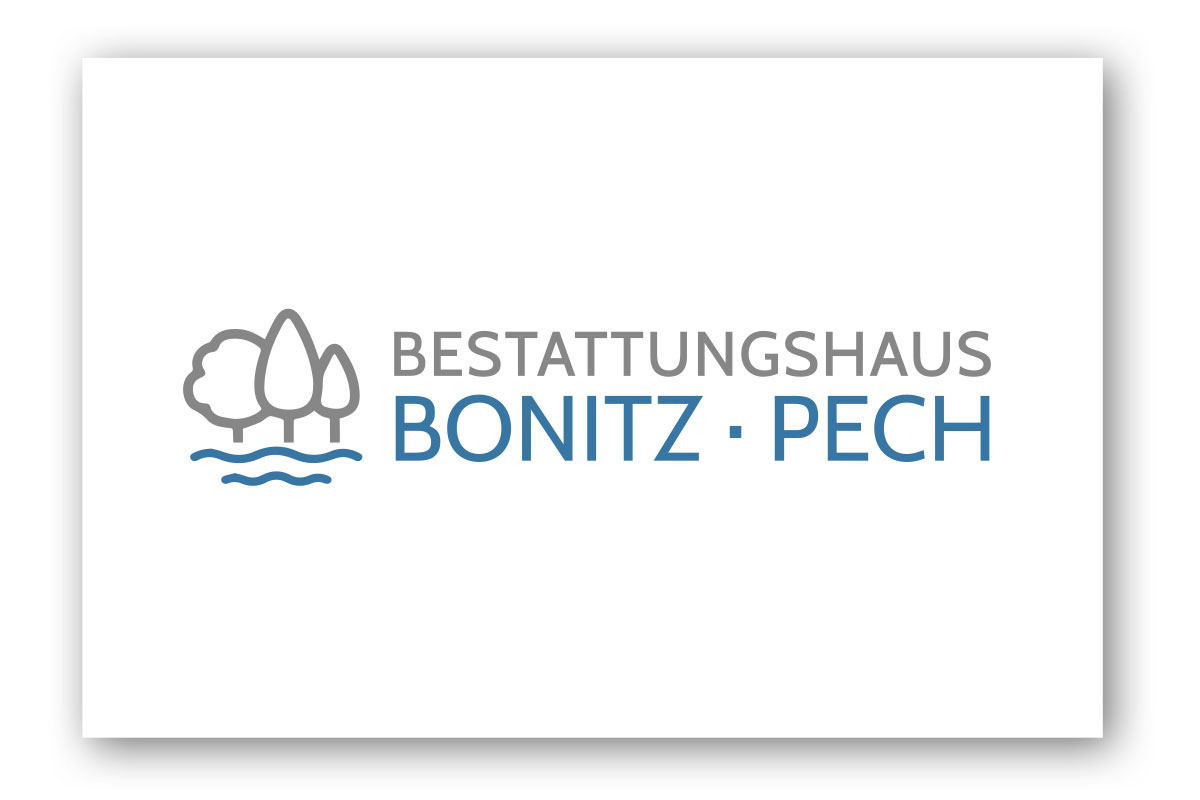 Genau dieses Bild haben wir zum grafischen Bestandteil des neuen Logos gemacht: eine stilisierte Baumgruppe an ebenso stilisierten Gewässerlinien. Den typografischen Teil des Logos haben wir modernisiert. Eine klare, serifenlose Schrift in Versalien zeigt nun prägnant den Firmennamen. Im Detail haben wir uns anstelle des vorher verwendeten Querstrichs für einen dezenteren Mittelpunkt zwischen den Familiennamen entschieden. Denn beim Firmennamen handelt es sich weder um einen Doppelnamen noch um die Namen von zwei aktuellen Inhabern: das Bestattungshaus ging 2009 von Familie Bonitz auf die Familie Pech über.